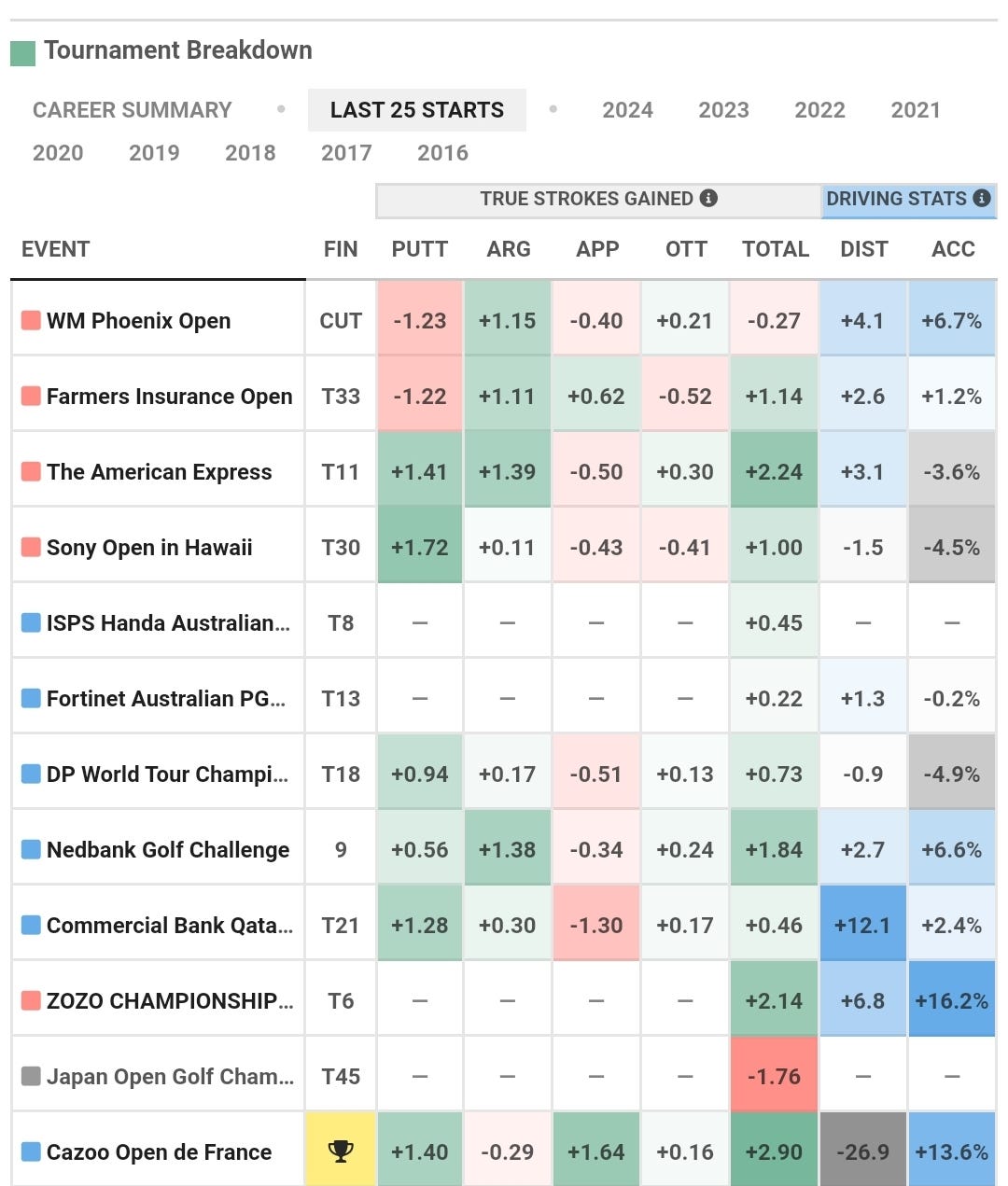 He has a number of good finishes including a win at the Cazoo back in September. He's not incredibly long off the tee but has an average drive over 300 yards he's 8th in birdies or better over the last 24 rounds. I'm not playing a ton of him but he's definitely worth a look.